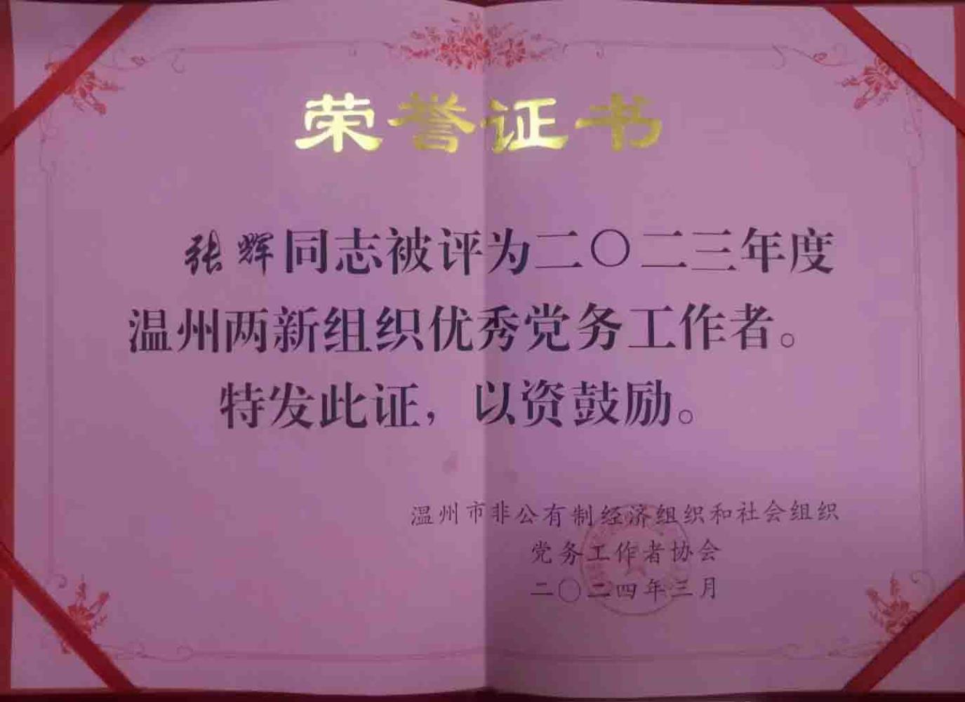 张辉同志被评为2023年度温州两新组织优异党务事情者